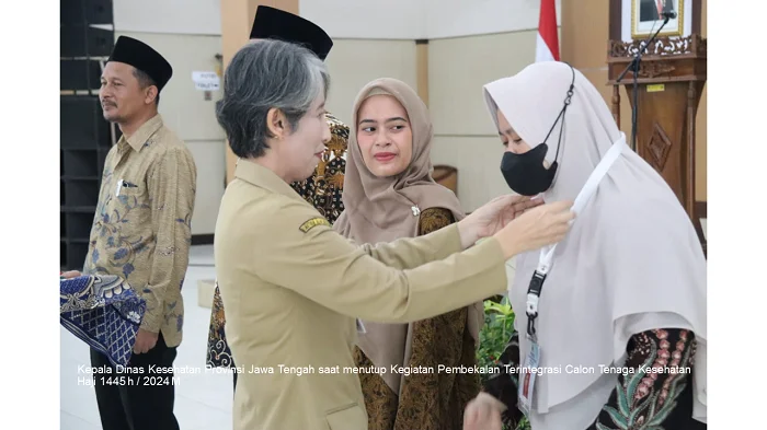 Hari ini telah dilaksanakan Penutupan Pembekalan Terintegrasi Calon Tenaga Kesehatan Haji 1445 H/2024 M. Pelepasan tanda peserta dilakukan oleh Ibu Kepala Dinas Kesehatan Provinsi Jawa Tengah. Beliau berpesan dalam kesempatan ini, agar para Calon Tenaga Kesehatan Haji senantiasa menjaga kesehatan dan kebugaran tubuh agar dapat memberikan pelayanan prima kepada para Calon Jamaah Haji baik selama sebelum maupun selama penyelenggaraan haji di tanah suci. Masih ada waktu kurang lebih 2 bulan, Kepala Dinas Kesehatan Provinsi Jawa Tengah memberikan PR agar para Calon Tenaga Kesehatan Haji melakukan olahraga setiap hari selama waktu yang tersisa untuk menambah kebugaran tubuh.