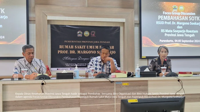 Kepala Dinas Kesehatan Provinsi Jawa Tengah hadir sebagai Pembahas bersama Biro Organisasi dan Biro Hukum Setda Provinsi Jawa Tengah dalam agenda Focus Group Discussion Pembahasan Rapergub Rumah Sakit Mata Jawa Tengah dan Rapergub RSUD Prof. Dr. Margono Soekarjo. Hadir pula Tim dari BKD, BPKAD, Bappeda Provinsi Jawa Tengah yang banyak memberikan masukan selama FGD berlangsung. Kepala Dinas Kesehatan Provinsi Jawa Tengah berharap seluruh komponen yang terlibat tetap solid untuk mengkawal kedua Rapergub hingga selesai sehingga nantinya dapat diimplementasikan.